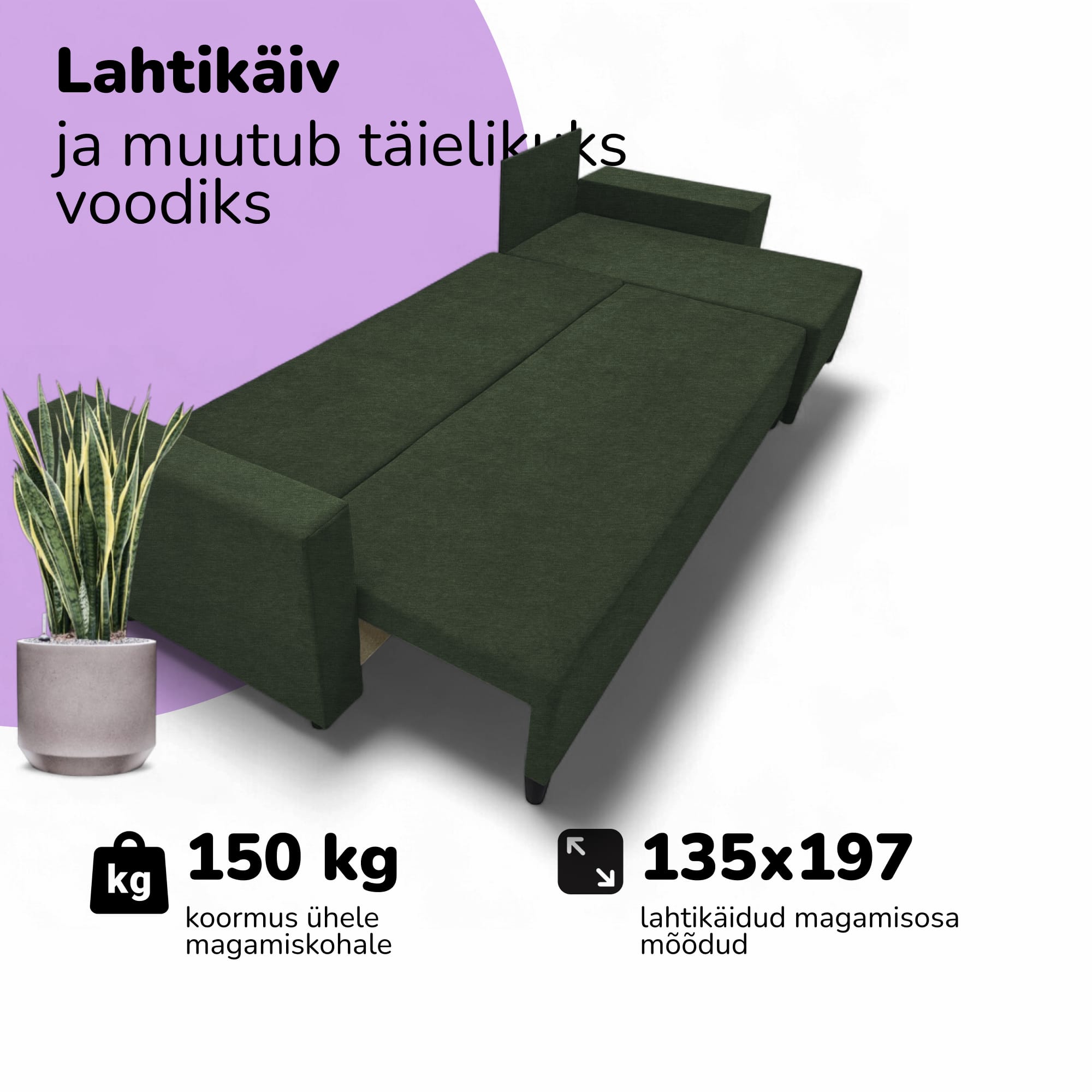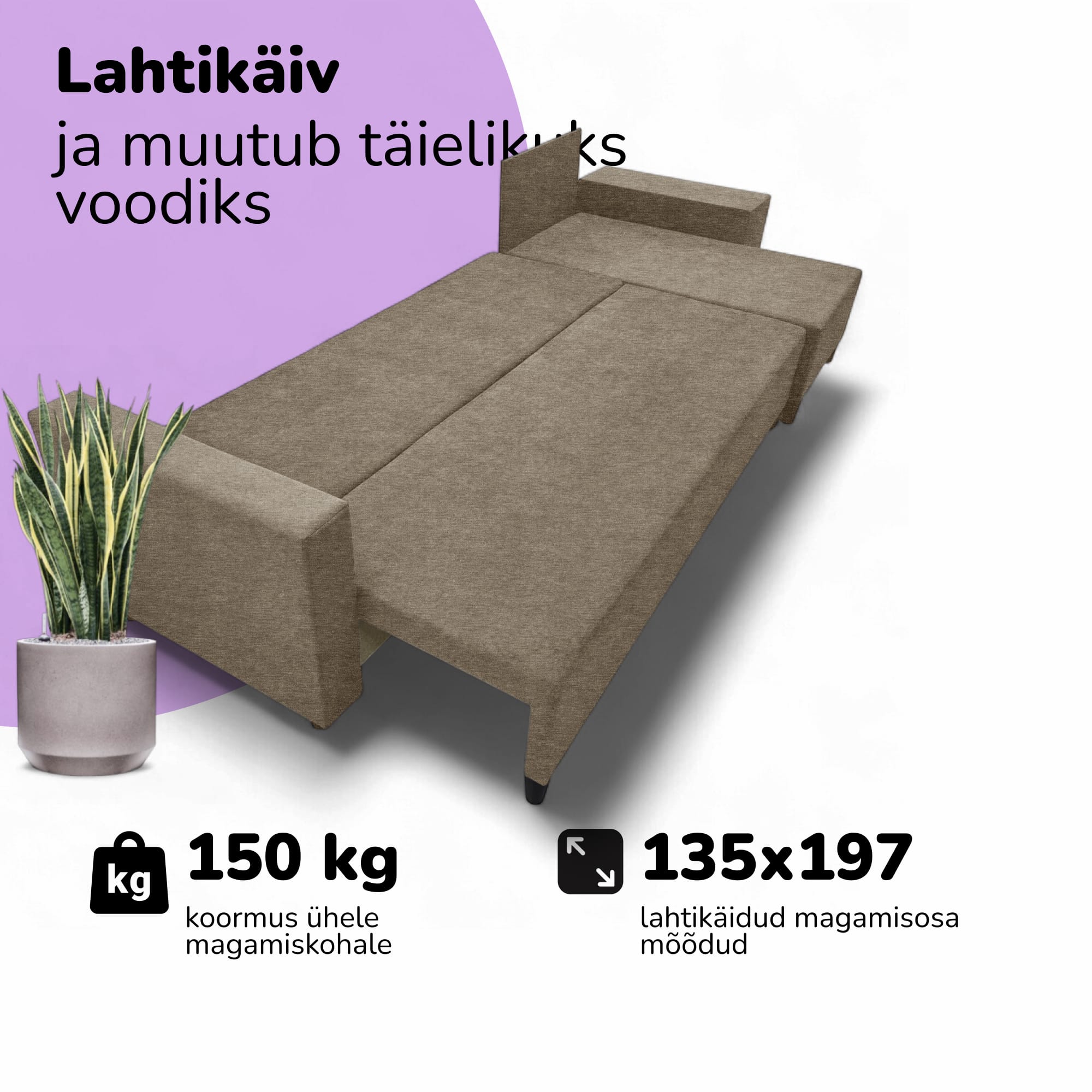 Ši kampinė sofa-lova su staliuku ir dviem kojūgaliais yra universalus sprendimas bet kokiam interjerui. Idealiai tinka kasdieniam naudojimui, nes turi universalią kampinę dalį (galima konfigūruoti kaip sofą-lovą su kairiuoju arba dešiniuoju porankiu), lengvai paverčiama į pilno dydžio lovą ir turi didelį patalynės laikymo skyrių. Komplekte yra stilingas staliukas ir du kojų atlošai, kuriuos galima patogiai naudoti kaip papildomas sėdynes arba atramas kojoms. Rėmas pagamintas iš patvarios medžio plokštės ir faneros, o visi sujungimai patikimai prisukti varžtais, todėl gerokai padidėja baldo tvirtumas ir ilgaamžiškumas. Užpildo medžiaga - didelio tankio putų poliuretanas, kuris greitai atgauna formą, užtikrindamas patogumą ir ilgaamžiškumą. Apmušalas - patvarus, tankus veliūras, malonus liesti, pralaidus orui ir lengvai valomas. Ši aplinkai nekenksminga medžiaga gali atlaikyti 35 000 "Martindale" testavimo ciklų. Modelį galima įsigyti populiarių spalvų: smėlio, rudos, geltonos, turkio žalios, šviesiai pilkos ir grafito. Sofoje dera ergonomiškas dizainas, praktiškumas ir estetika. Ji atspari dėmėms, lengvai sulankstoma, nereikalauja daug priežiūros ir puikiai tinka bet kokiam kambariui - nuo virtuvės iki miegamojo. Rekomenduojama valyti muiluotu vandeniu sukamaisiais judesiais. Šiame puikiame sprendime dera kaina ir funkcionalumas - idealus pasirinkimas vertinantiems patogumą, praktiškumą ir stilių.