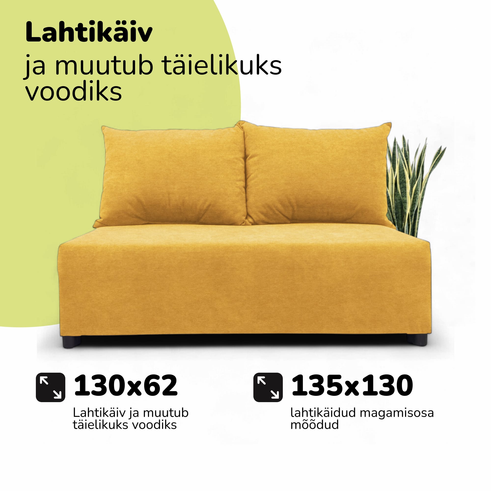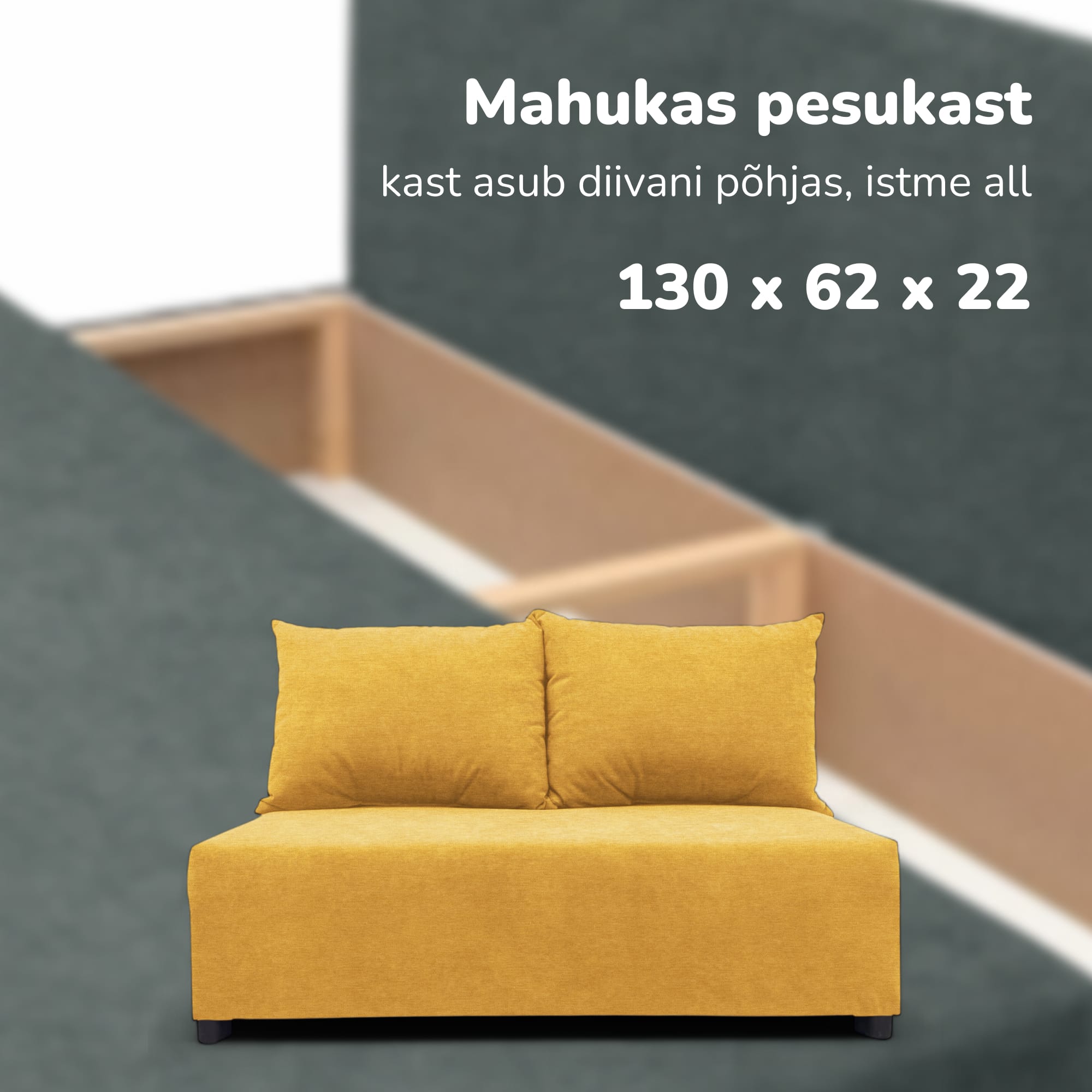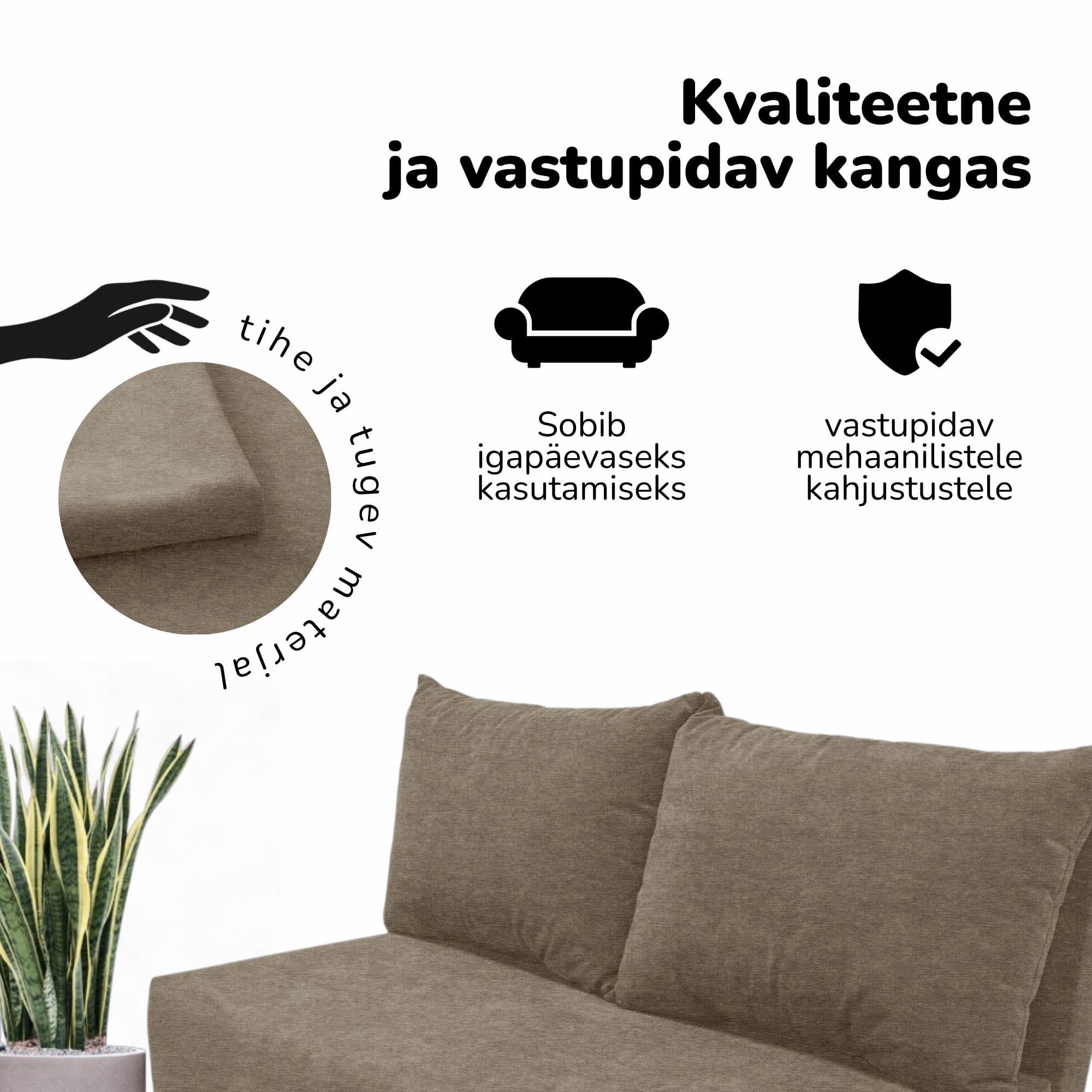 Ši dvivietė sofa-lova be porankių yra praktiškas ir patogus sprendimas kasdieniam naudojimui bet kokiame interjere. Ji lengvai paverčiama pilnaverte lova, turi erdvų stalčių patalynei ar kitiems daiktams susidėti, užima mažai vietos ir puikiai tinka vaikų kambariui, virtuvei, miegamajam ar biurui. Rėmas pagamintas iš patvarios medžio drožlių plokštės ir faneros. Visi elementai tarpusavyje susukti varžtais, kad būtų itin patikimi ir ilgaamžiai. Užpildas - didelio tankio baldų klasės poliuretano putos, kurios laikui bėgant išlaiko savo formą ir suteikia komfortiško tvirtumo. Apmušalas pagamintas iš tankaus veliūro - ekologiškos, orui pralaidžios ir minkštos medžiagos. Audinys atsparus trinčiai (35 000 ciklų pagal Martindale testą). Galimos universalios spalvos: smėlio, ruda, geltona, turkio žalia, šviesiai pilka ir grafito. Ergonomiškas dizainas, kompaktiškas dydis, paprastas surinkimas, lengva priežiūra ir patvarios medžiagos daro šią sofą puikiu pasirinkimu ieškantiems maksimalaus funkcionalumo už prieinamą kainą. Audinį rekomenduojama valyti muiluotu vandeniu švelniais sukamaisiais judesiais.