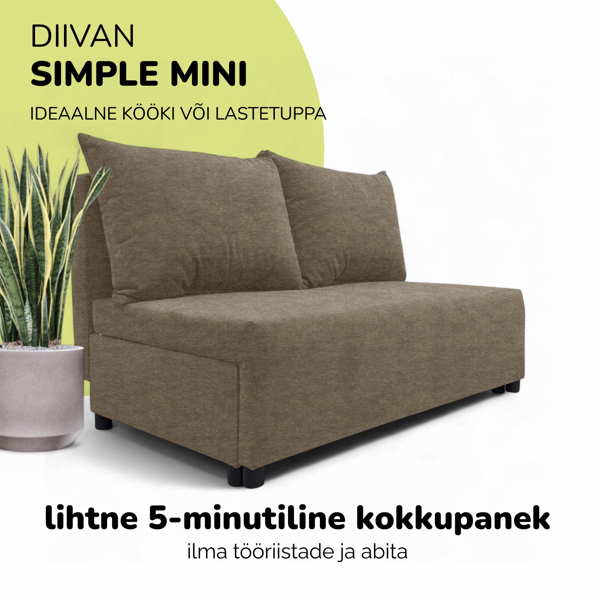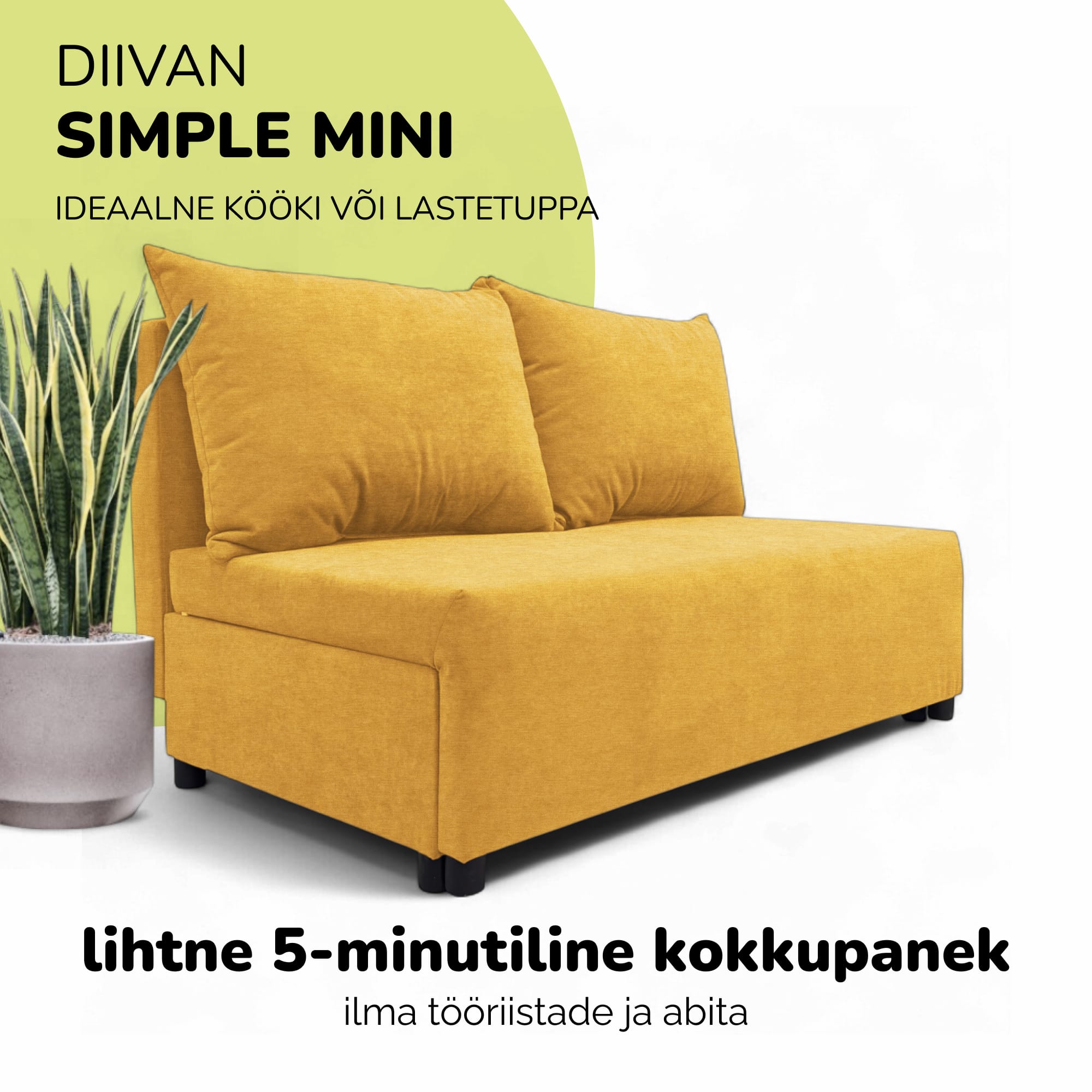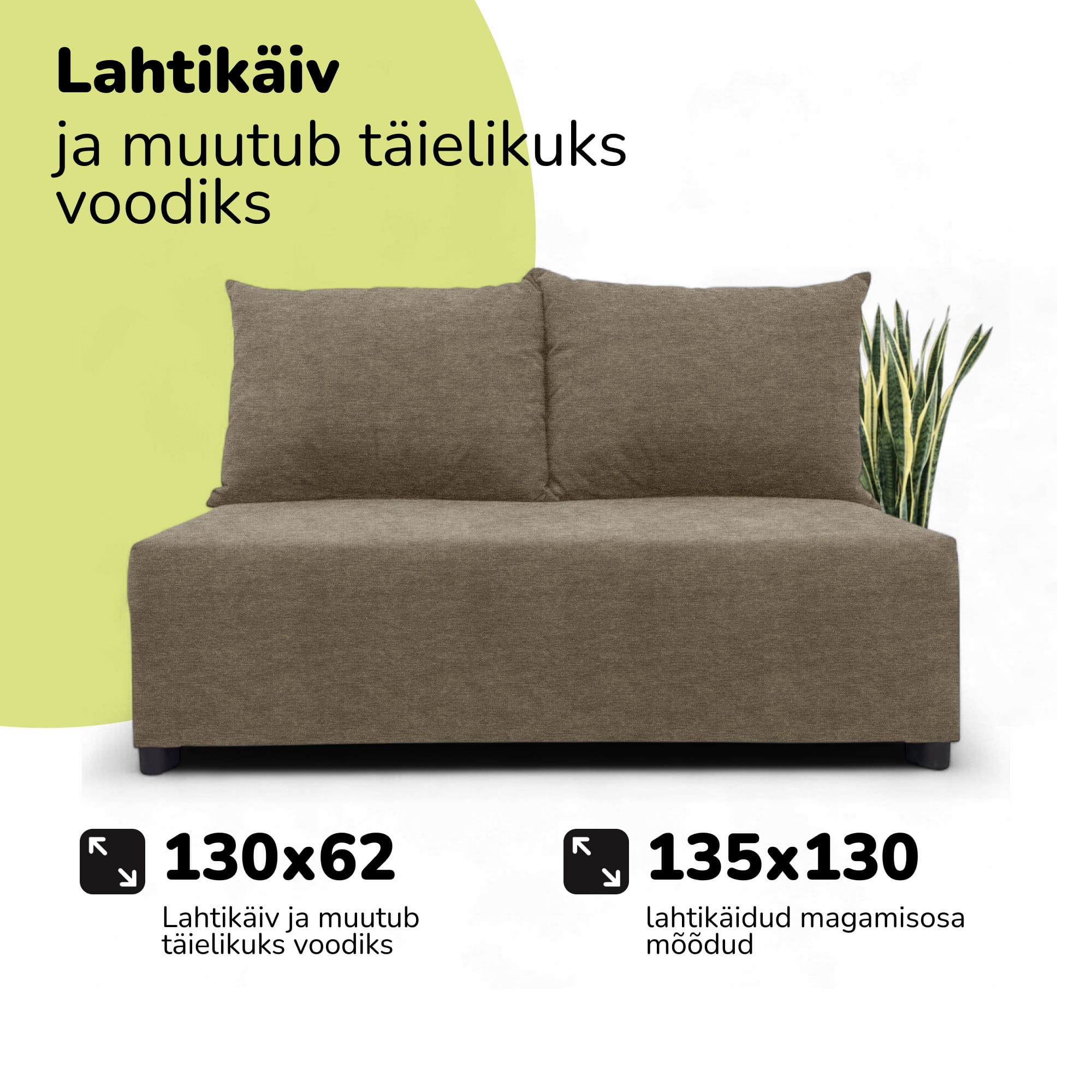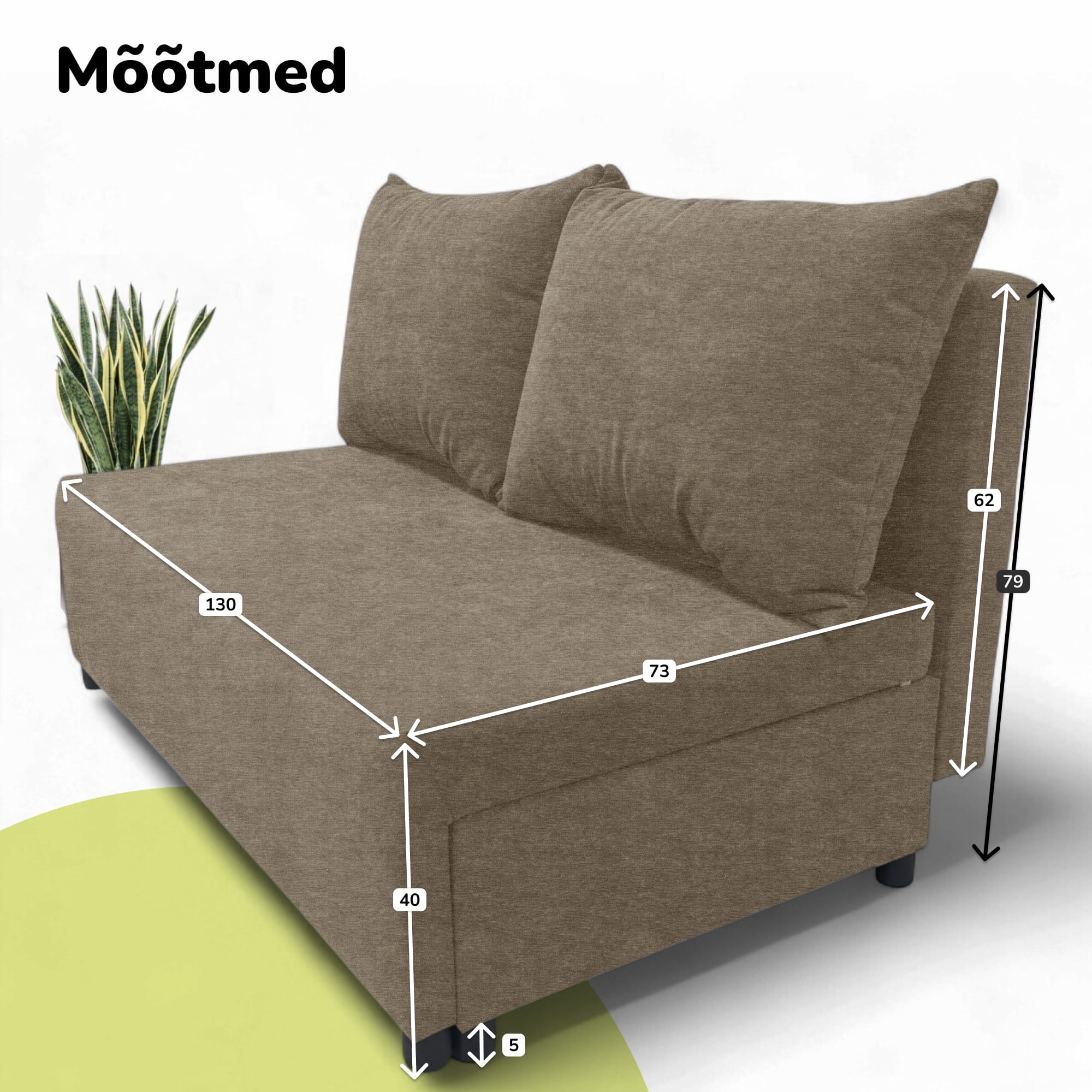 Ši dvivietė sofa-lova be porankių yra praktiškas ir patogus sprendimas kasdieniam naudojimui bet kokiame interjere. Ji lengvai paverčiama pilnaverte lova, turi erdvų stalčių patalynei ar kitiems daiktams susidėti, užima mažai vietos ir puikiai tinka vaikų kambariui, virtuvei, miegamajam ar biurui. Rėmas pagamintas iš patvarios medžio drožlių plokštės ir faneros. Visi elementai tarpusavyje susukti varžtais, kad būtų itin patikimi ir ilgaamžiai. Užpildas - didelio tankio baldų klasės poliuretano putos, kurios laikui bėgant išlaiko savo formą ir suteikia komfortiško tvirtumo. Apmušalas pagamintas iš tankaus veliūro - ekologiškos, orui pralaidžios ir minkštos medžiagos. Audinys atsparus trinčiai (35 000 ciklų pagal Martindale testą). Galimos universalios spalvos: smėlio, ruda, geltona, turkio žalia, šviesiai pilka ir grafito. Ergonomiškas dizainas, kompaktiškas dydis, paprastas surinkimas, lengva priežiūra ir patvarios medžiagos daro šią sofą puikiu pasirinkimu ieškantiems maksimalaus funkcionalumo už prieinamą kainą. Audinį rekomenduojama valyti muiluotu vandeniu švelniais sukamaisiais judesiais.