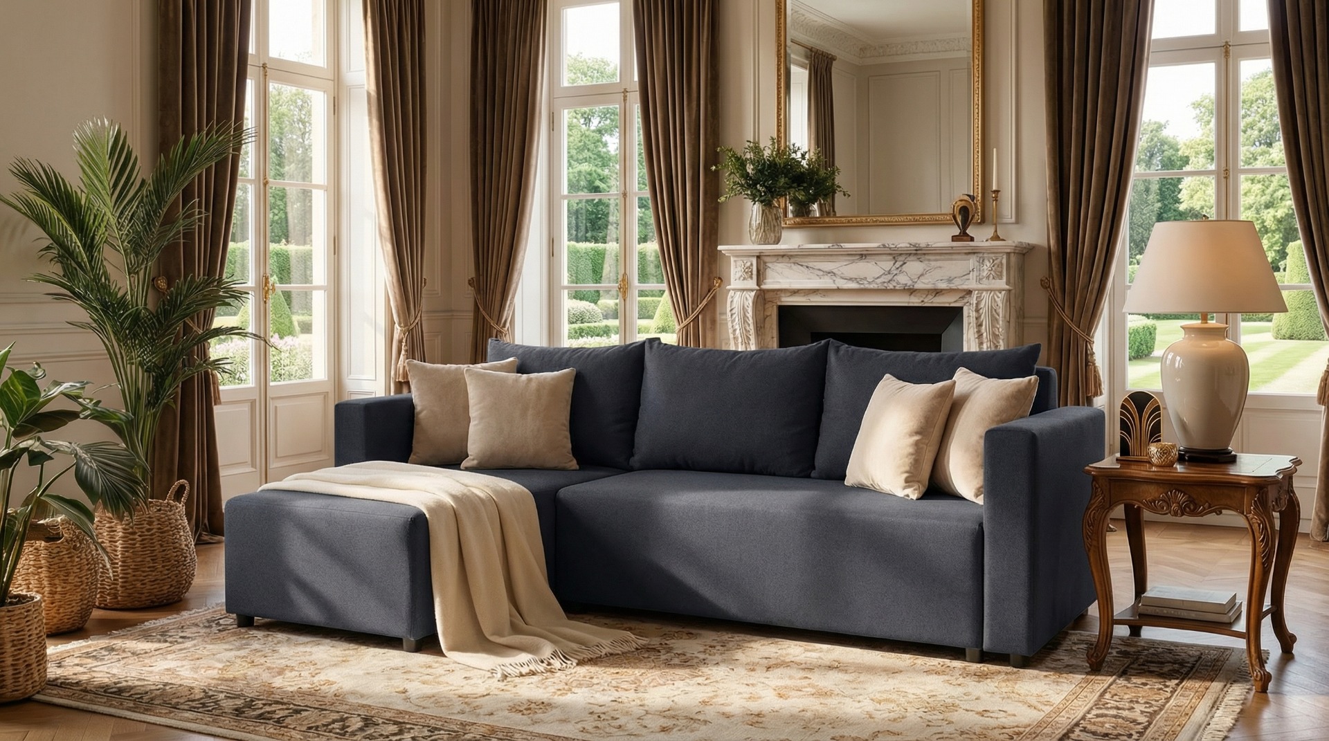 KAMPINĖ SOFA-LOVA SU IŠSKLEIDŽIAMA LOVA IR SAUGYKLA STURYJE