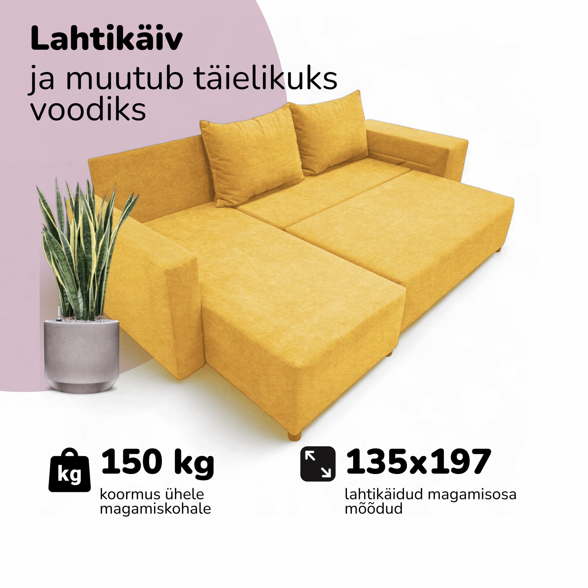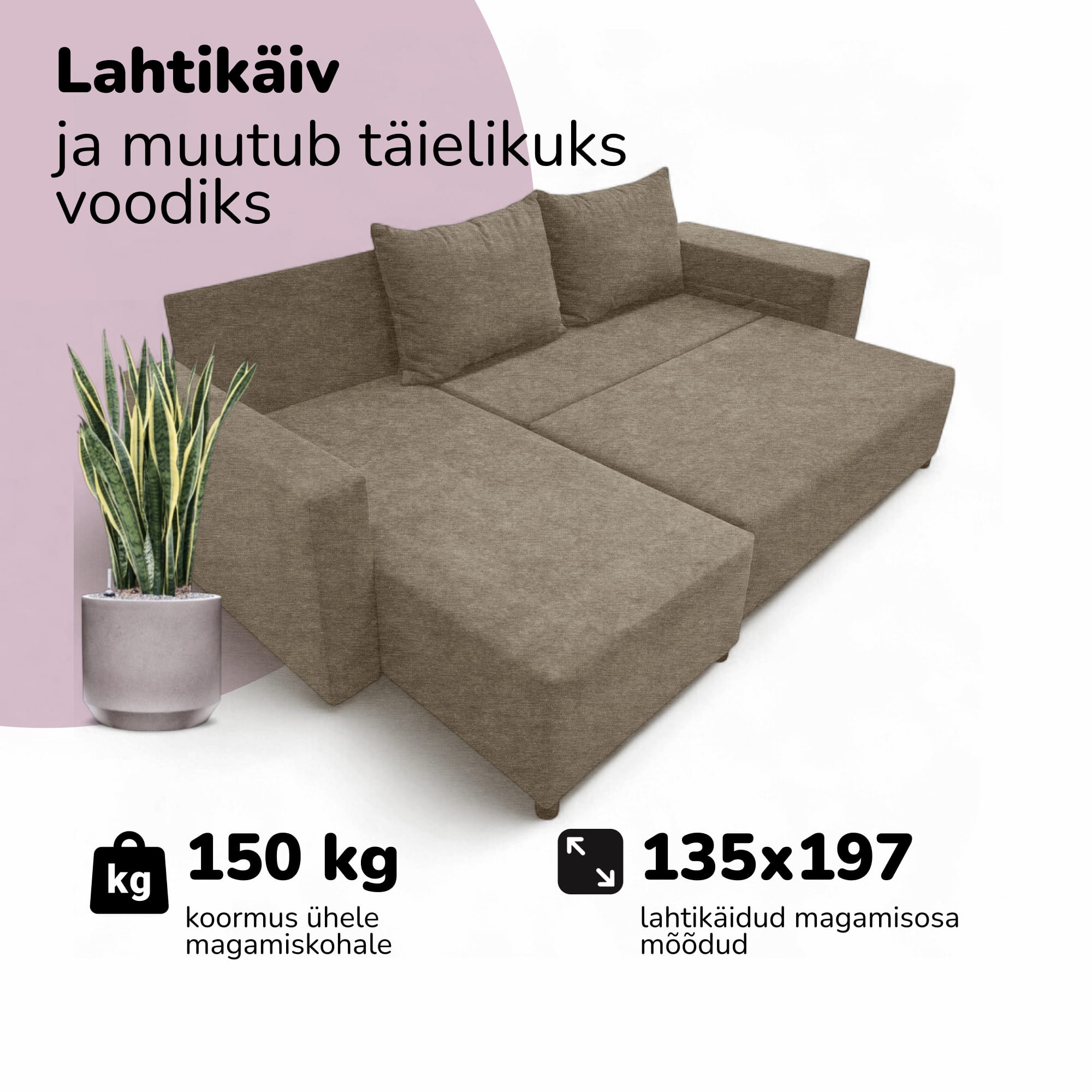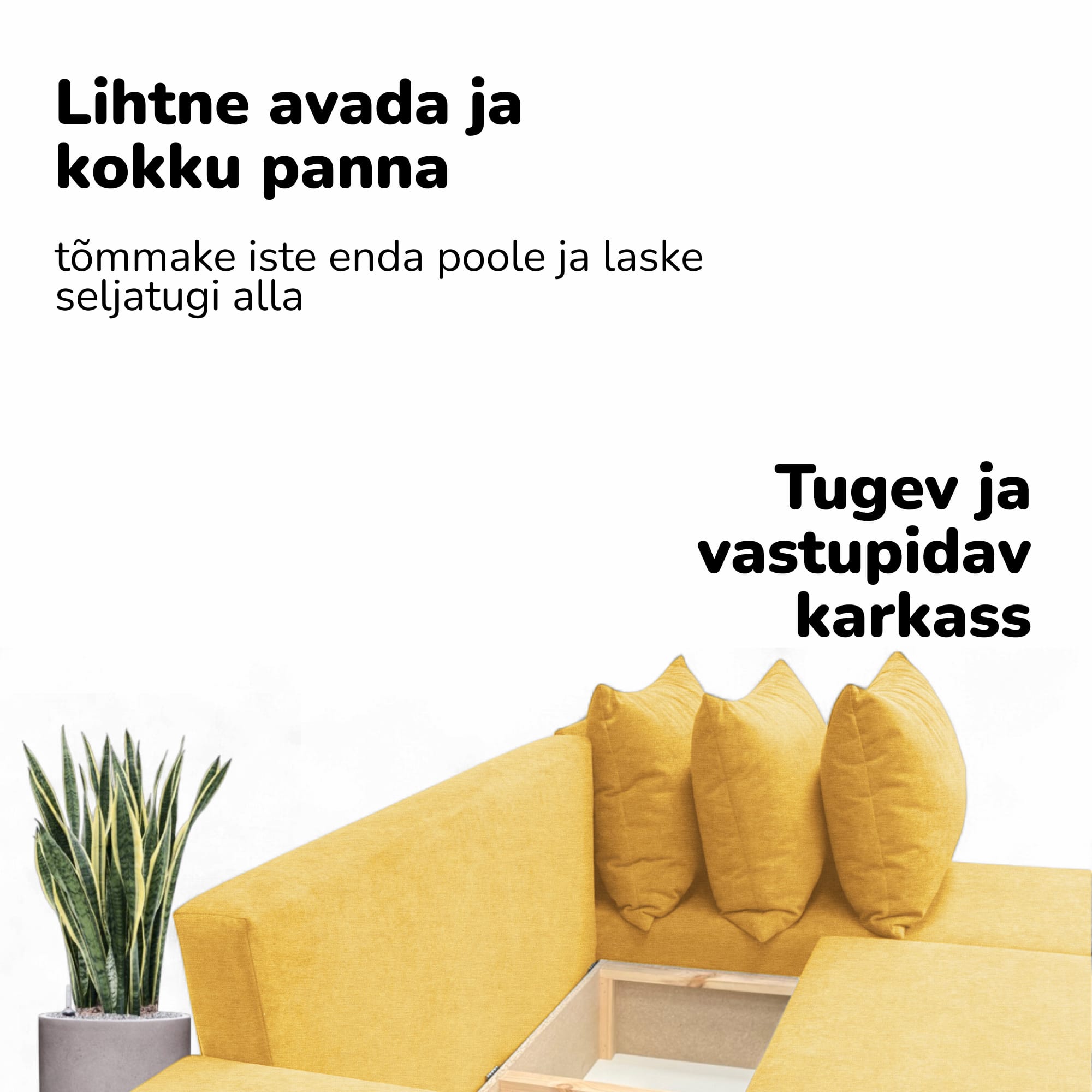Ši kampinė sofa-lova su staliuku ir dviem kojūgaliais yra universalus sprendimas bet kokiam interjerui. Ji idealiai tinka kasdieniam naudojimui, yra kompaktiška, turi universalią kampinę dalį (galima konfigūruoti kaip sofą-lovą su kairiuoju arba dešiniuoju porankiu), lengvai paverčiama į pilno dydžio lovą ir turi erdvų stalčių patalynei. Komplekte yra stilingas staliukas ir du kojūgaliai, kuriuos galima patogiai naudoti kaip papildomas sėdynes arba atramas kojoms. Rėmas pagamintas iš patvarios medžio plokštės ir faneros, o visi sujungimai tvirtai prisukti varžtais, todėl gerokai padidėja baldo tvirtumas ir ilgaamžiškumas. Užpildo medžiaga - didelio tankio putų poliuretanas, kuris greitai atgauna formą, užtikrindamas patogumą ir ilgaamžiškumą. Apmušalas - patvarus, tankus veliūras, malonus liesti, pralaidus orui ir lengvai valomas. Ši aplinkai nekenksminga medžiaga gali atlaikyti 35 000 "Martindale" testavimo ciklų. Modelį galima įsigyti populiarių spalvų: smėlio, rudos, geltonos, turkio žalios, šviesiai pilkos ir grafito. Sofoje dera ergonomiškas dizainas, praktiškumas ir estetika. Ji atspari dėmėms, lengvai sulankstoma, nereikalauja daug priežiūros ir puikiai tinka bet kokiam kambariui - nuo virtuvės iki miegamojo. Rekomenduojama valyti muiluotu vandeniu sukamaisiais judesiais. Šiame puikiame sprendime dera kaina ir funkcionalumas - idealus pasirinkimas vertinantiems patogumą, praktiškumą ir stilių.