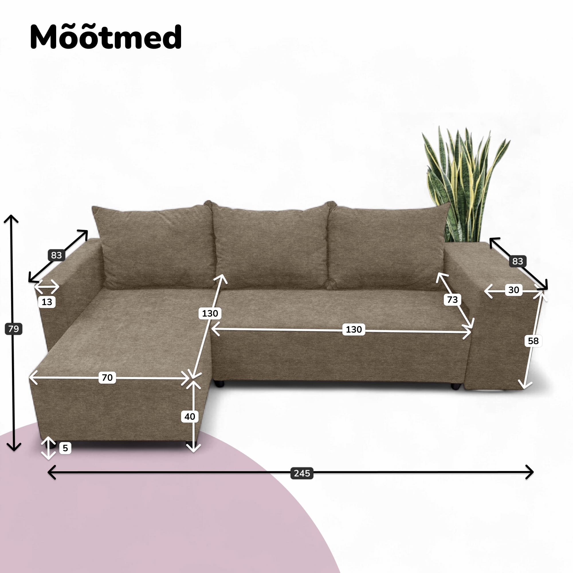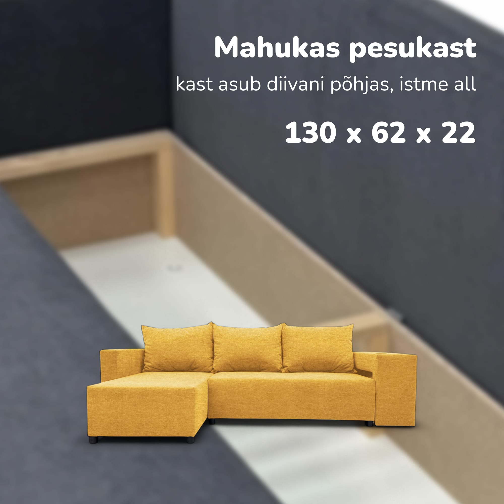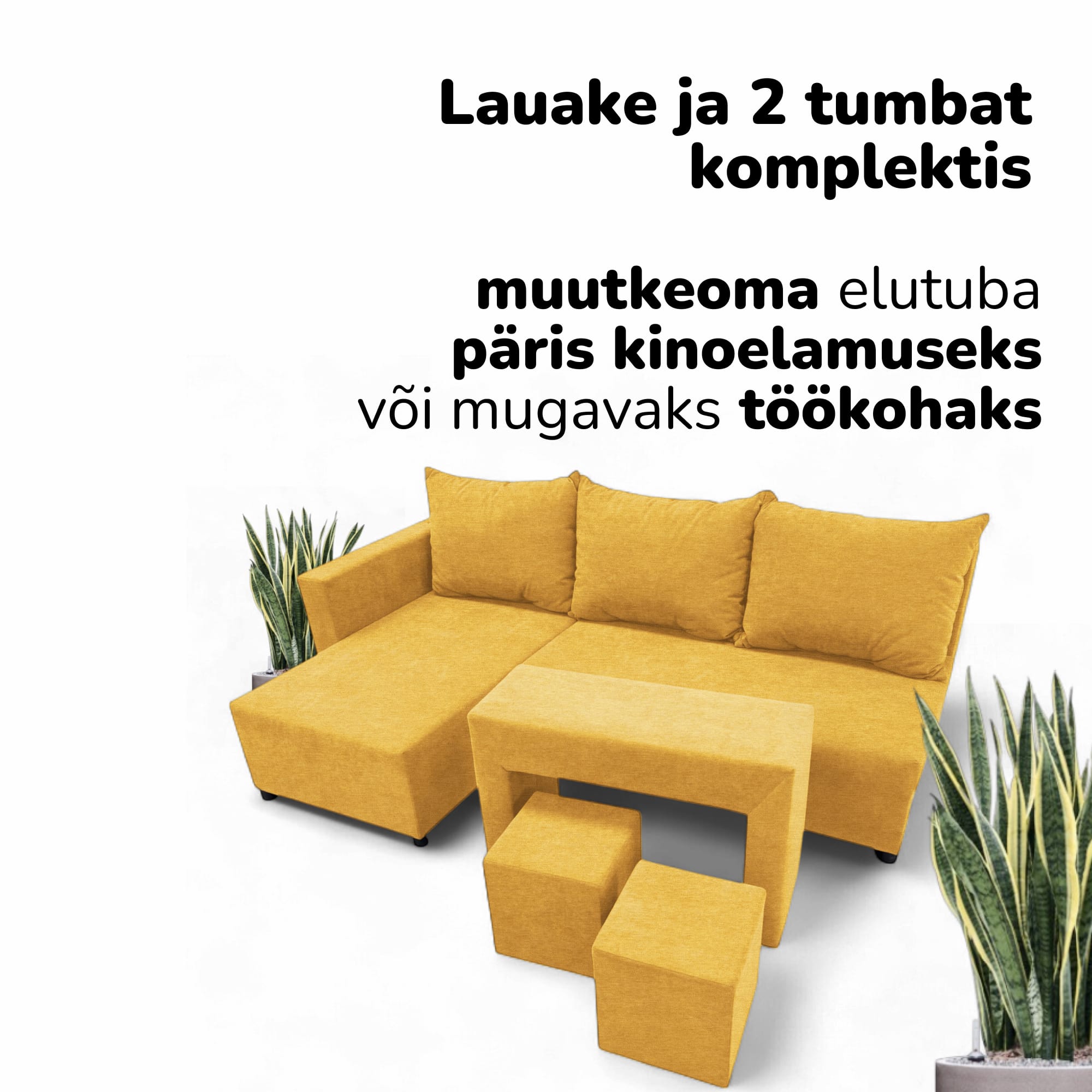 Ši kampinė sofa-lova su staliuku ir dviem kojūgaliais yra universalus sprendimas bet kokiam interjerui. Ji idealiai tinka kasdieniam naudojimui, yra kompaktiška, turi universalią kampinę dalį (galima konfigūruoti kaip sofą-lovą su kairiuoju arba dešiniuoju porankiu), lengvai paverčiama į pilno dydžio lovą ir turi erdvų stalčių patalynei. Komplekte yra stilingas staliukas ir du kojūgaliai, kuriuos galima patogiai naudoti kaip papildomas sėdynes arba atramas kojoms. Rėmas pagamintas iš patvarios medžio plokštės ir faneros, o visi sujungimai tvirtai prisukti varžtais, todėl gerokai padidėja baldo tvirtumas ir ilgaamžiškumas. Užpildo medžiaga - didelio tankio putų poliuretanas, kuris greitai atgauna formą, užtikrindamas patogumą ir ilgaamžiškumą. Apmušalas - patvarus, tankus veliūras, malonus liesti, pralaidus orui ir lengvai valomas. Ši aplinkai nekenksminga medžiaga gali atlaikyti 35 000 "Martindale" testavimo ciklų. Modelį galima įsigyti populiarių spalvų: smėlio, rudos, geltonos, turkio žalios, šviesiai pilkos ir grafito. Sofoje dera ergonomiškas dizainas, praktiškumas ir estetika. Ji atspari dėmėms, lengvai sulankstoma, nereikalauja daug priežiūros ir puikiai tinka bet kokiam kambariui - nuo virtuvės iki miegamojo. Rekomenduojama valyti muiluotu vandeniu sukamaisiais judesiais. Šiame puikiame sprendime dera kaina ir funkcionalumas - idealus pasirinkimas vertinantiems patogumą, praktiškumą ir stilių.