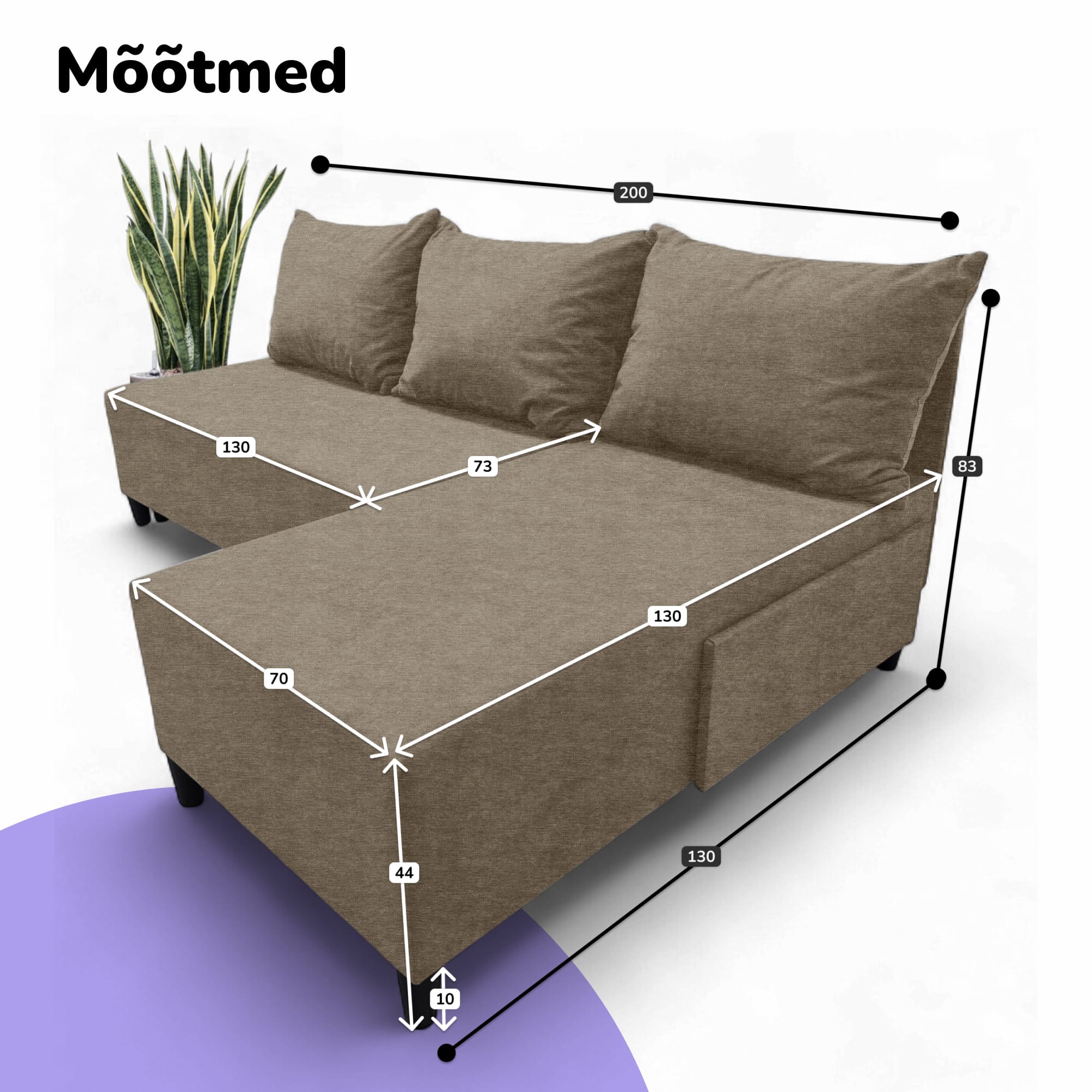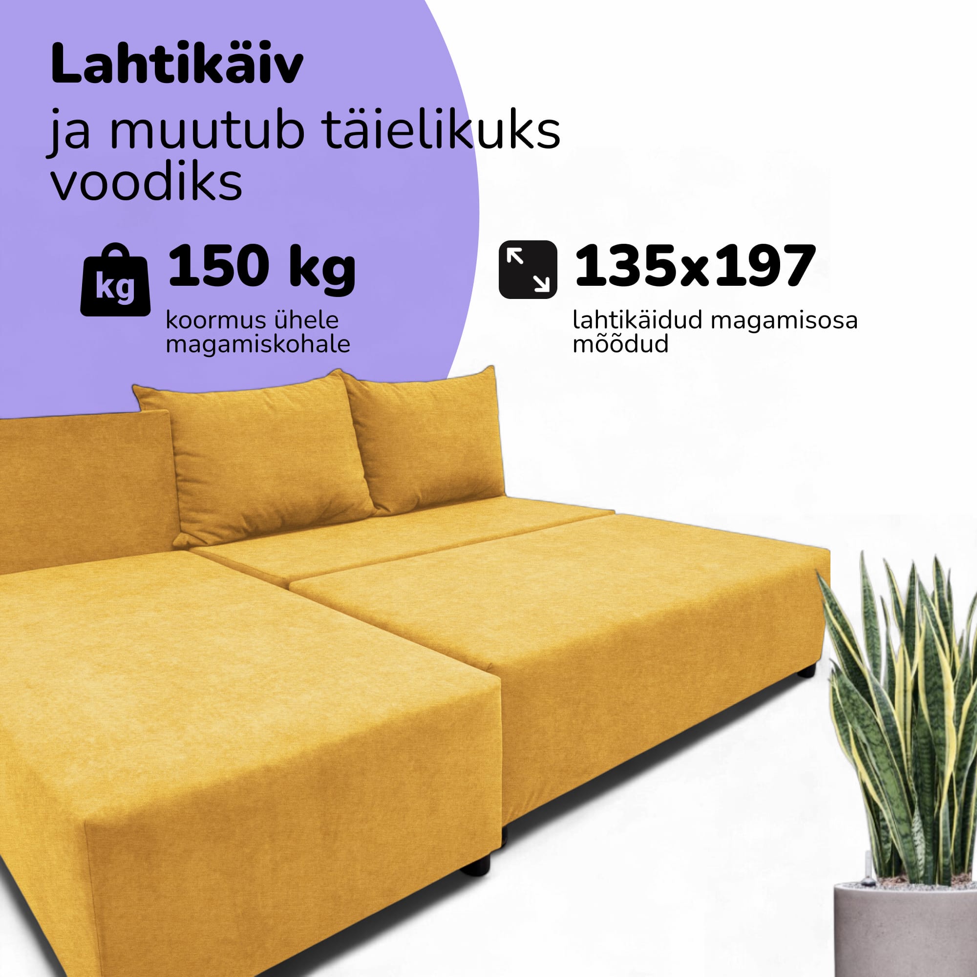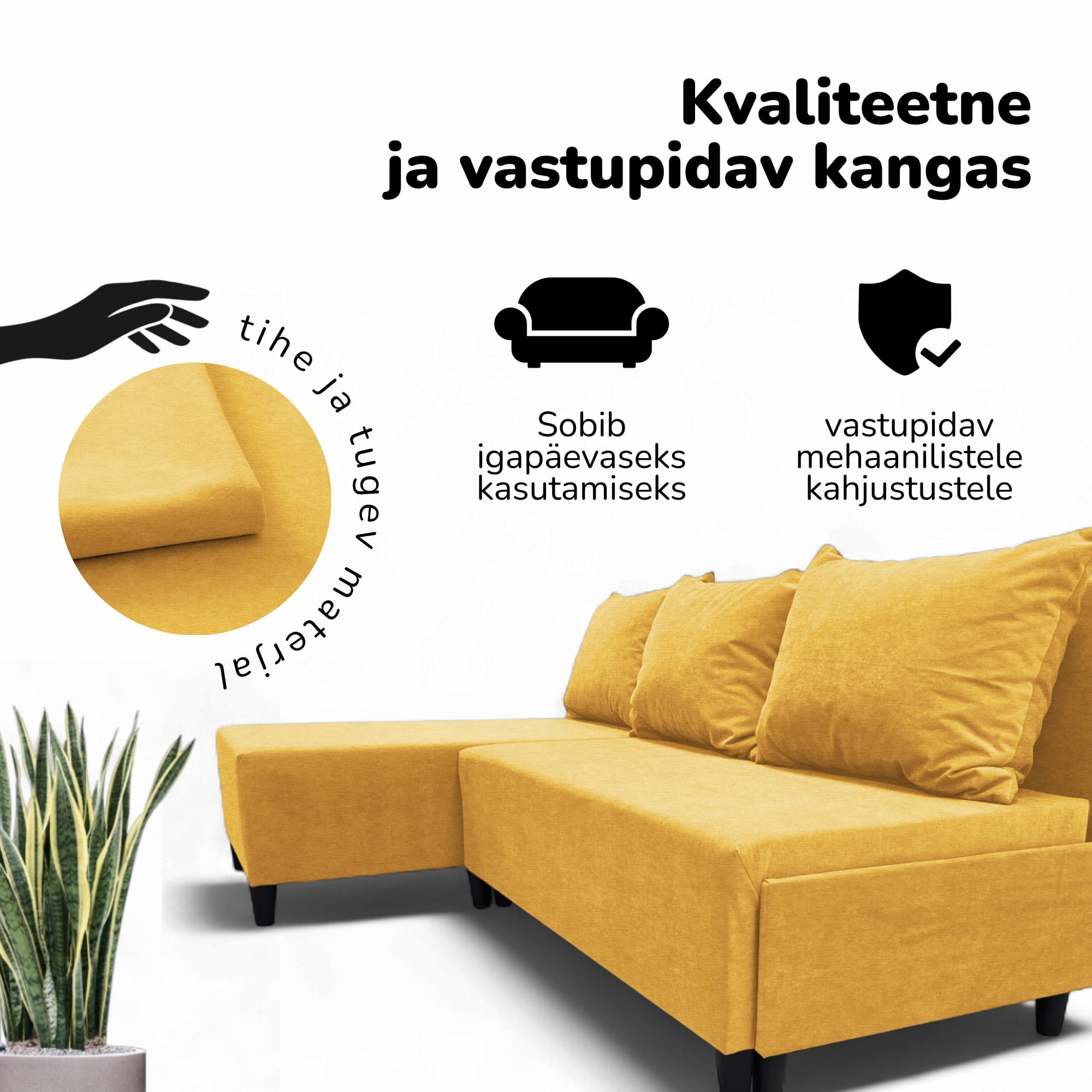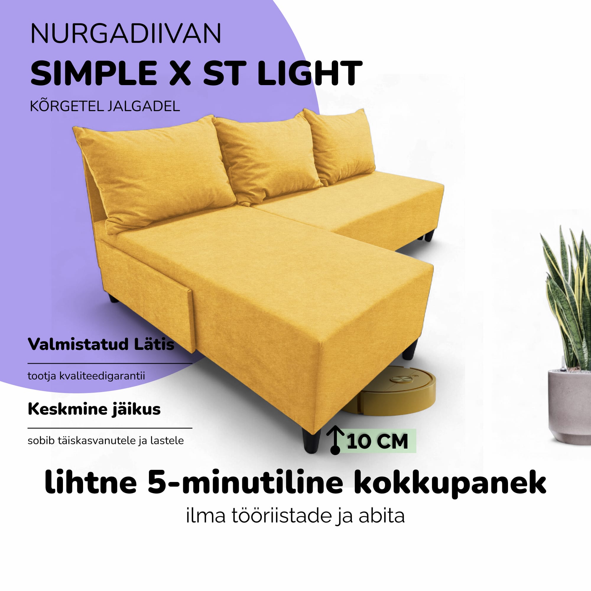 Ši kampinė sofa-lova be porankių yra universalus ir kompaktiškas sprendimas mažiems butams ir moderniems interjerams. Dėl universalios kampinės konstrukcijos ją galima sukonfigūruoti tiek kairėje, tiek dešinėje pusėje, todėl ji idealiai tinka bet kokiam kambariui. Ji lengvai paverčiama į pilno dydžio lovą, o įmontuotame stalčiuje galima patogiai laikyti patalynę ir kitus daiktus. Rėmas pagamintas iš labai tvirtos medienos ir faneros. Visos jungtys prisukamos varžtais, kad būtų ypač patikimos ir ilgaamžės. Kaip užpildas panaudotos didelio tankio poliuretano putos, kurios greitai atgauna savo formą ir užtikrina komfortą tiek sėdint, tiek miegant. Apmušalas pagamintas iš tankaus veliūro - ekologiškos, orui pralaidžios ir minkštos medžiagos. Jį lengva valyti ir jis atsparus dėvėjimuisi, tai patvirtina Martindale testas (35 000 ciklų). Šį modelį galima rinktis iš įvairių spalvų: smėlio, rudos, geltonos, turkio žalios, šviesiai pilkos ir grafito. Modernaus ir ergonomiško dizaino divanas tinka svetainėms, miegamiesiems, virtuvėms, biurams ar vaikų kambariams. Jo funkcionalumas apima vidutinį kietumą, atsparumą dėmėms, lengvą priežiūrą, kompaktišką dydį, ekologiškumą, lengvą surinkimą ir puikų kainos ir kokybės santykį. Tai praktiškas ir stilingas sprendimas vertinantiems patogumą ir universalumą. Priežiūra nesudėtinga: dėmes pašalinkite muiluotu vandeniu sukamaisiais judesiais.