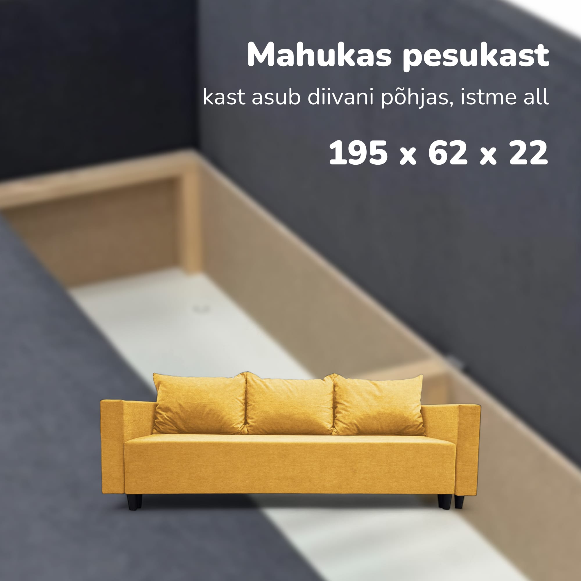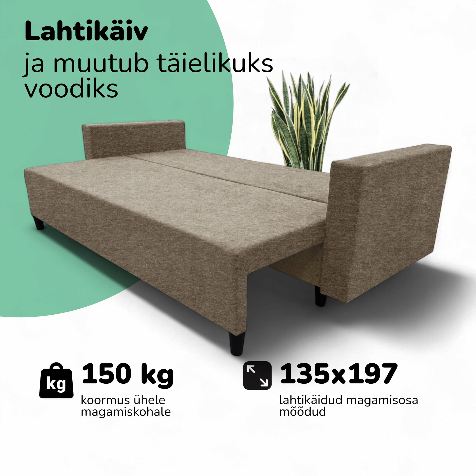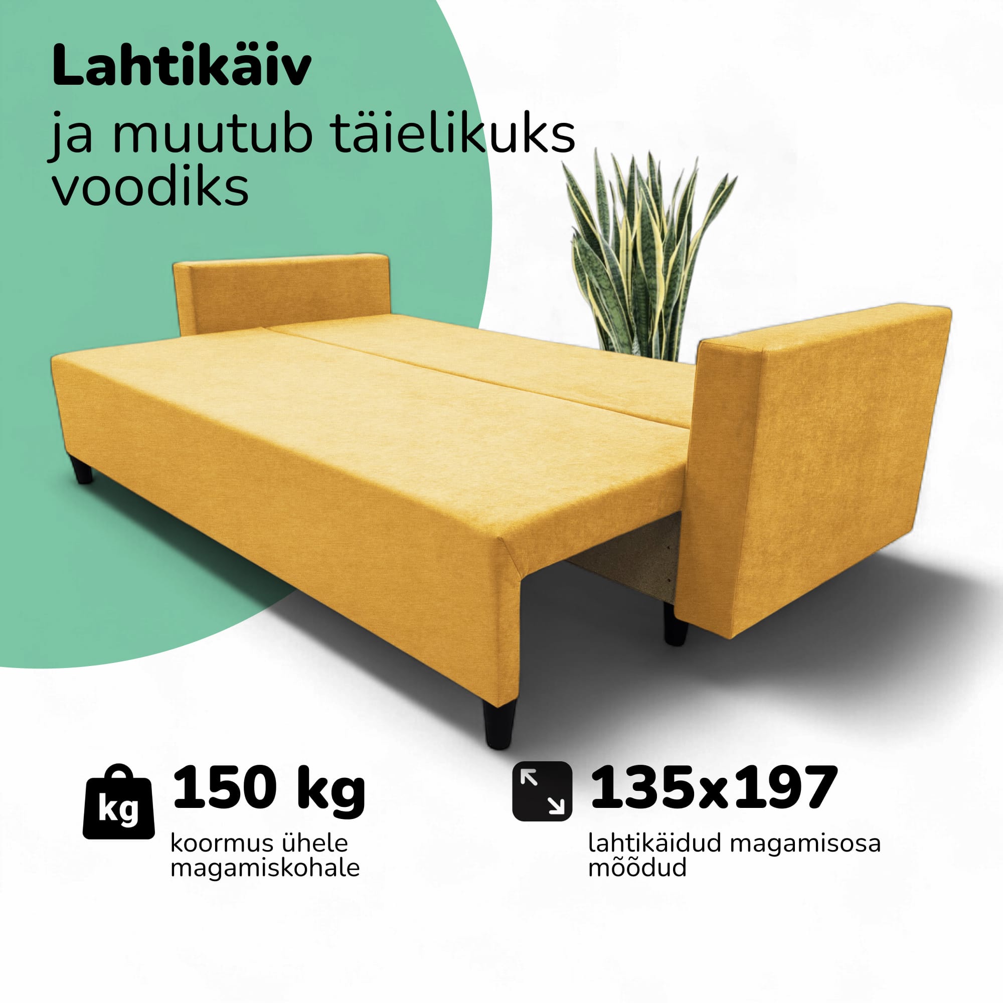 Ši dvigulė sofa-lova yra universalus ir kompaktiškas kasdienio naudojimo sprendimas. Ji lengvai paverčiama pilnaverte lova ir turi erdvų stalčių patalynės dėžei, todėl yra ypač patogi mažose erdvėse, pavyzdžiui, studijose, vaikų kambariuose, virtuvėse ar biuruose. Rėmas pagamintas iš patvarių medžio plokščių ir faneros. Visos jungtys sutvirtintos varžtais, o ne sąvaržomis, todėl labai padidėja sofos tvirtumas ir ilgaamžiškumas. Užpildas - didelio tankio baldų klasės poliuretano putos, kurios greitai atgauna formą ir užtikrina vidutinio kietumo komfortą. Apmušalas - tankus veliūras: malonus liesti, pralaidus orui, ekologiškas, lengvai valomas ir atsparus nusidėvėjimui (35 000 ciklų pagal Martindale testą). Modelį galima rinktis šešių universalių spalvų: smėlio, rudos, geltonos, turkio žalios, šviesiai pilkos ir grafito - visos tinka bet kokiam interjerui. Dėl stilingos išvaizdos, patvarios konstrukcijos, lengvos priežiūros ir apgalvoto funkcionalumo ši sofa yra puikus pasirinkimas, pasižymintis puikiu kainos ir kokybės santykiu. Priežiūra nesudėtinga: valykite paviršių muiluotu vandeniu sukamaisiais judesiais.
