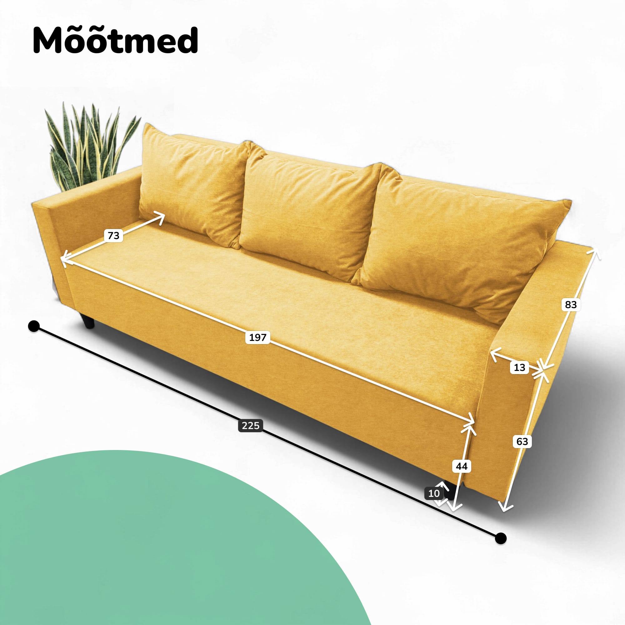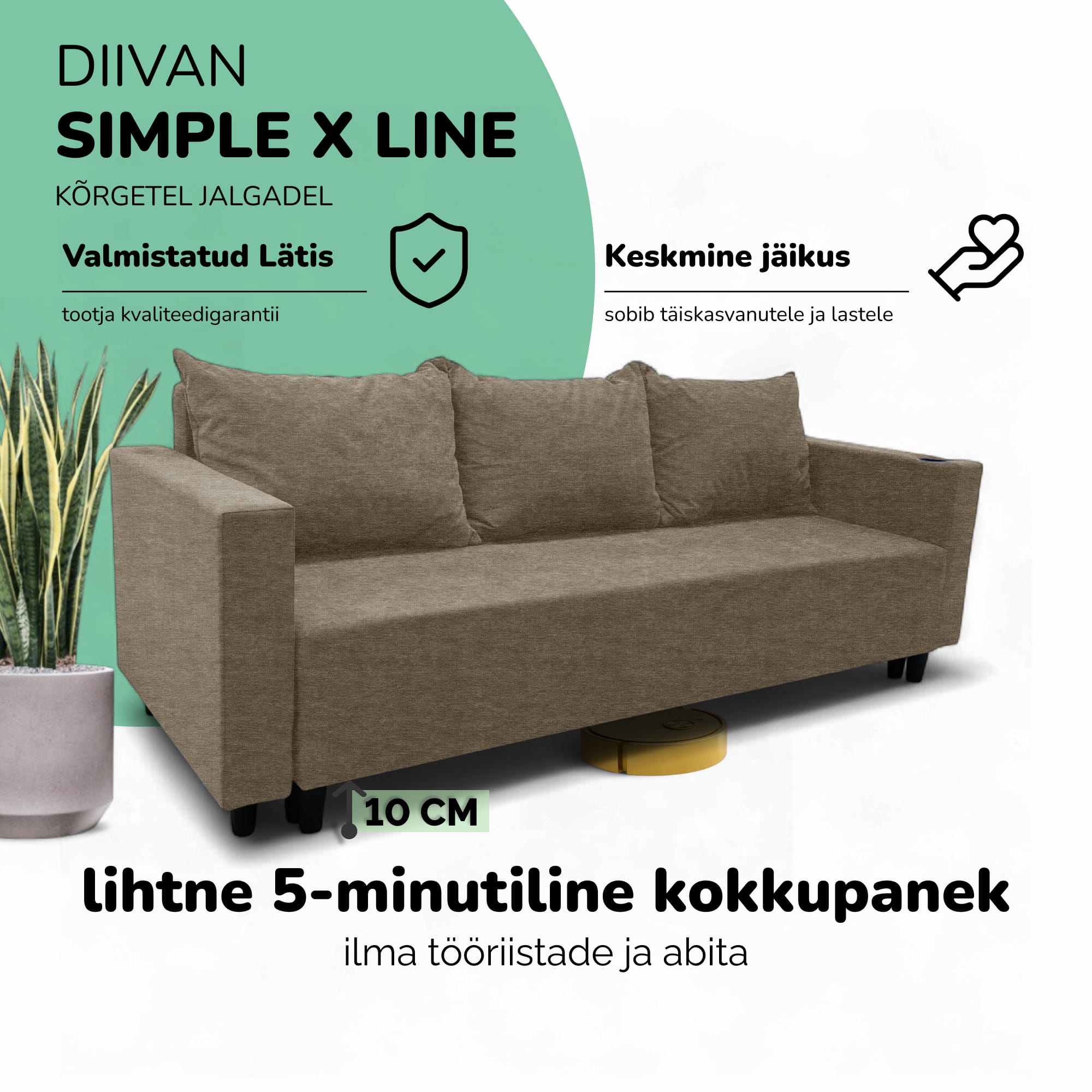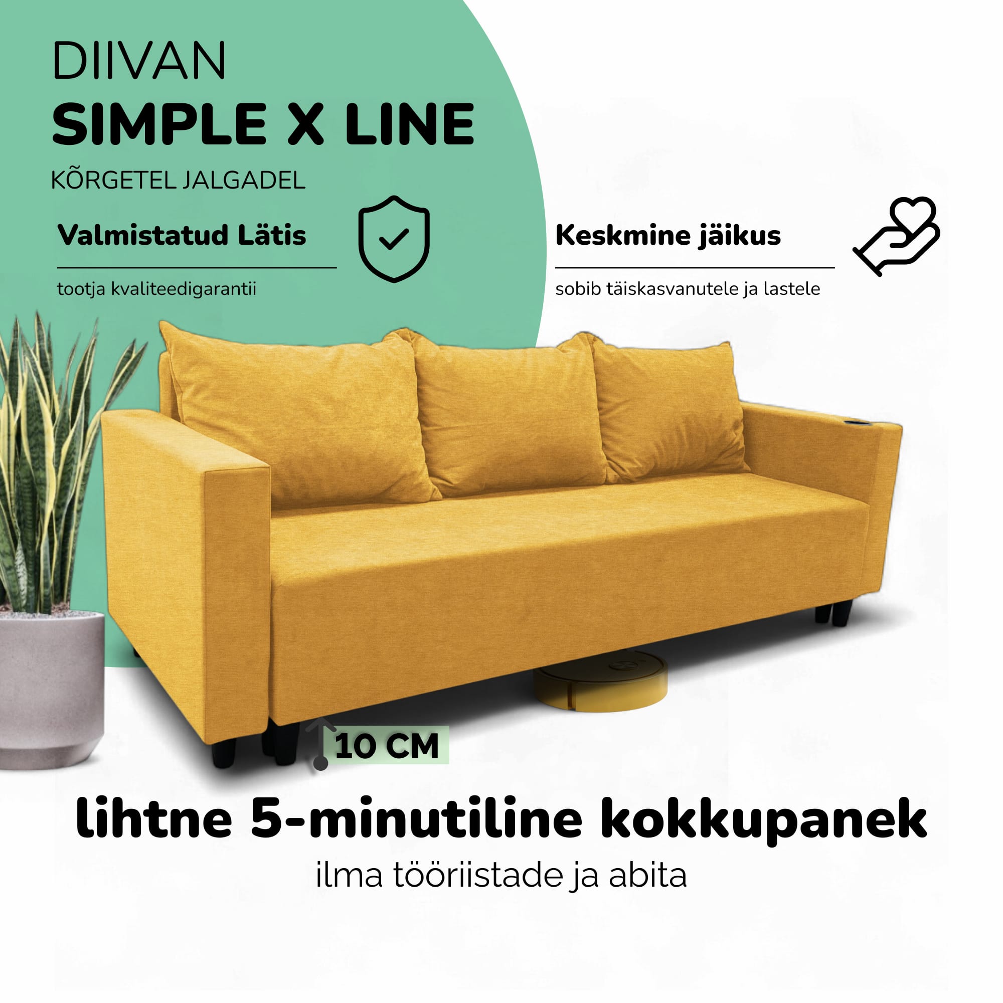 Ši dvigulė sofa-lova yra universalus ir kompaktiškas kasdienio naudojimo sprendimas. Ji lengvai paverčiama pilnaverte lova ir turi erdvų stalčių patalynės dėžei, todėl yra ypač patogi mažose erdvėse, pavyzdžiui, studijose, vaikų kambariuose, virtuvėse ar biuruose. Rėmas pagamintas iš patvarių medžio plokščių ir faneros. Visos jungtys sutvirtintos varžtais, o ne sąvaržomis, todėl labai padidėja sofos tvirtumas ir ilgaamžiškumas. Užpildas - didelio tankio baldų klasės poliuretano putos, kurios greitai atgauna formą ir užtikrina vidutinio kietumo komfortą. Apmušalas - tankus veliūras: malonus liesti, pralaidus orui, ekologiškas, lengvai valomas ir atsparus nusidėvėjimui (35 000 ciklų pagal Martindale testą). Modelį galima rinktis šešių universalių spalvų: smėlio, rudos, geltonos, turkio žalios, šviesiai pilkos ir grafito - visos tinka bet kokiam interjerui. Dėl stilingos išvaizdos, patvarios konstrukcijos, lengvos priežiūros ir apgalvoto funkcionalumo ši sofa yra puikus pasirinkimas, pasižymintis puikiu kainos ir kokybės santykiu. Priežiūra nesudėtinga: valykite paviršių muiluotu vandeniu sukamaisiais judesiais.
